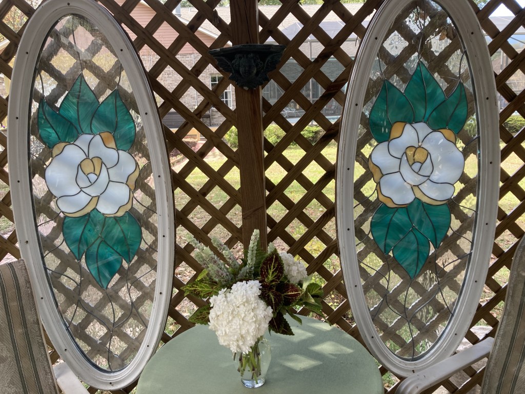 The fern house is a structure that my husband built over 25 years ago in the back yard. It has a wooden floor, a copper colored metal roof and lattice walls that support the moonflower vines in the summer months. By definition, a fern house is a structure to provide shade and shelter for growing ferns. While I do have ferns around it, it is much more to me. It is my sanctuary, a place where I retreat to whenever I need to relax, write, meditate and plan my garden. There is a ceiling fan that cools me in the hot summer and a small outdoor heater for cool winter mornings. There is a small table and chairs for when I have friends over and a glider with pillows and a cozy quilt for when I want to read or take an afternoon nap.